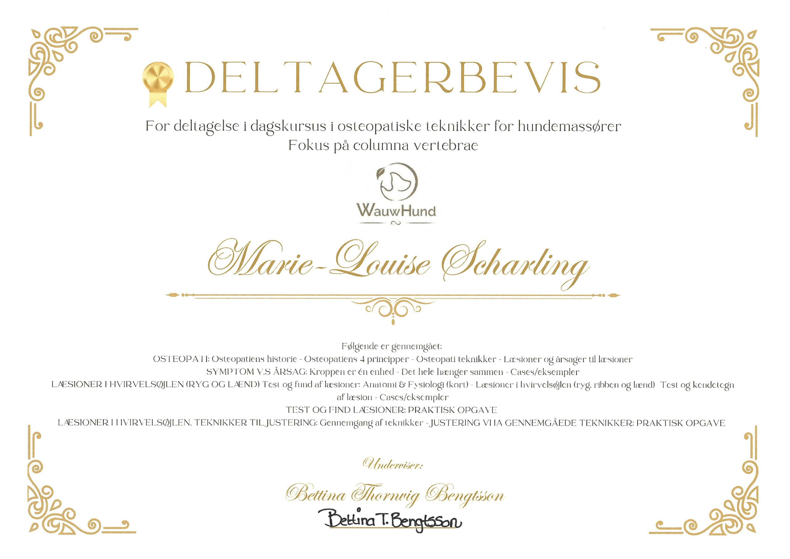 Min drivkraft er at behandle hunde samt at formidle viden, som kan hjælpe hundeejeren med at forstå deres hund. Jeg deltager løbende i kurser for hele tiden at være opdateret.